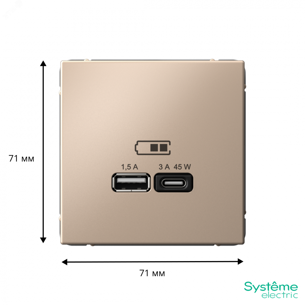Розетка Systeme Electric серии ArtGallery в цвете песочный двойная USB с разъемами типа A+C высокоскоростная. Трендовый оттенок позволит удачно подчеркнуть стиль интерьера и правильно расставить акценты. Самая современная USB-зарядка с двумя разъемами позволяет заряжать как стандартные мобильные устройства через разъем типа А, так и новейшие устройства с разъемом типа С. Мощность: тип-A – 7.5 Вт, тип-С 45Вт. Поддерживает современные протоколы быстрой зарядки QC, PD, последних версий. Лучший промышленный дизайн (по итогам премии МИНПРОМТОРГ 2023).