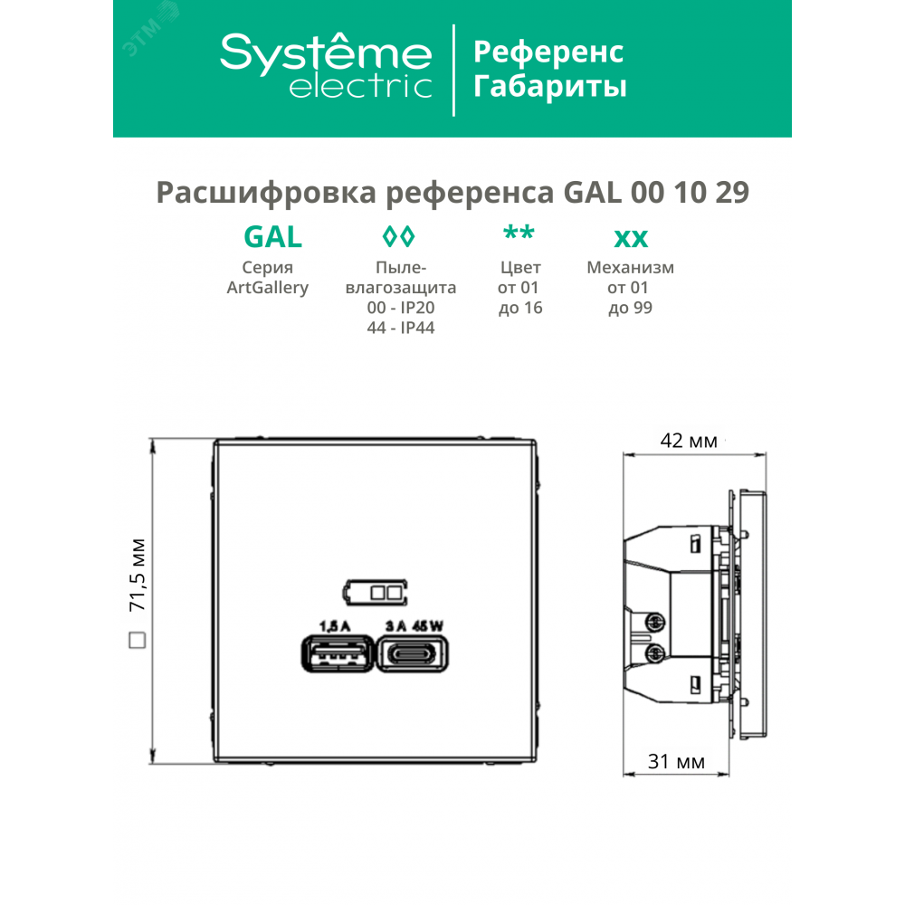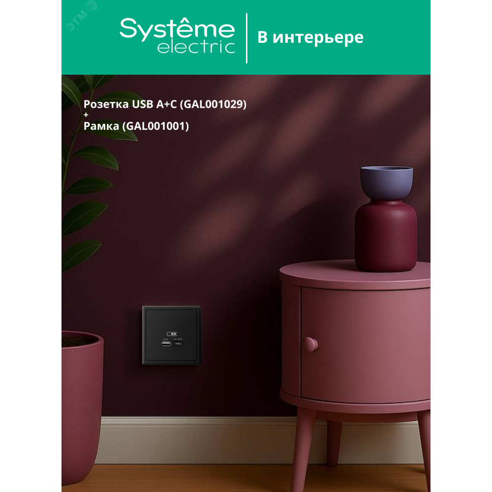 Розетка Systeme Electric серии ArtGallery в цвете карбон двойная USB с разъемами типа A+C высокоскоростная. К изделиям в этом роскошном цвете приятно прикоснуться. Самая современная USB-зарядка с двумя разъемами позволяет заряжать как стандартные мобильные устройства через разъем типа А, так и новейшие устройства с разъемом типа С. Мощность: тип-A – 7.5 Вт, тип-С 45Вт. Поддерживает современные протоколы быстрой зарядки QC, PD, последних версий. Лучший промышленный дизайн (по итогам премии МИНПРОМТОРГ 2023).