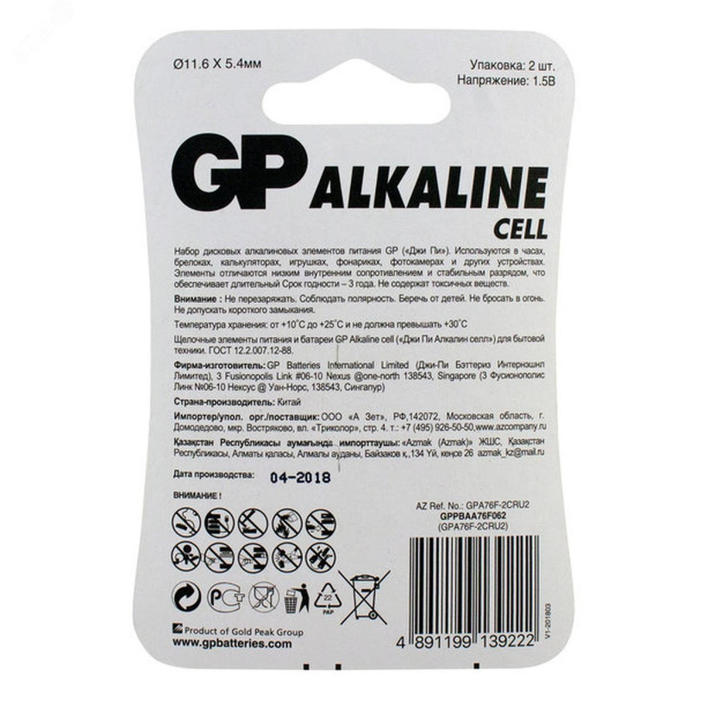 Батарейка пуговичная алкалиновая GP A76 - 2 шт. на одном блистере 12289, Батарейка стандартная