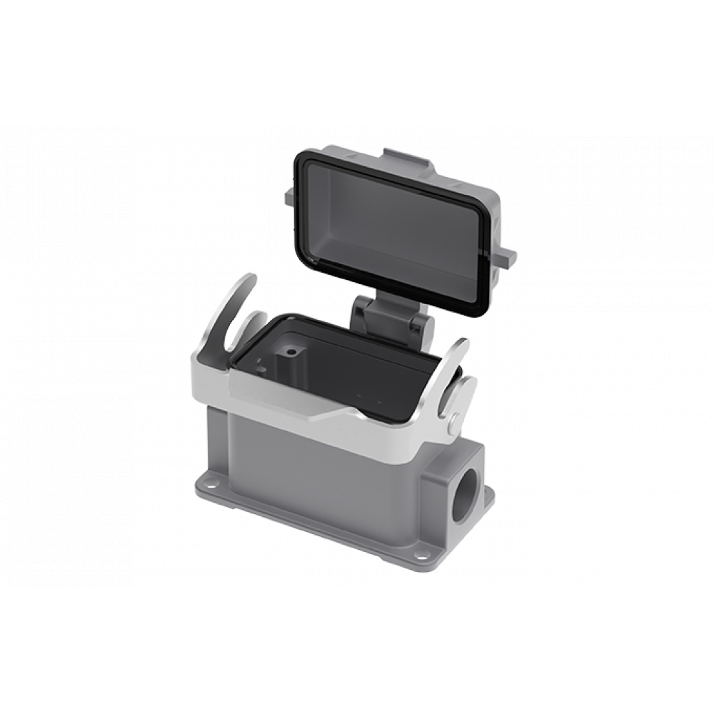 Основание разъема на панель, закрытое, типоразмер 10B, с уплотнителем, 2 отверстия с резьбой для кабельных вводов M20x1,5, с одной защелкой, с защитной крышкой, материал корпуса: алюминиевый сплав