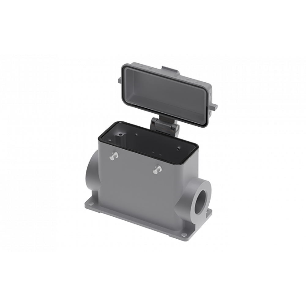 Основание разъема на панель, закрытое, типоразмер 16B, высокое исполнение, с уплотнителем, 2 отверстия с резьбой для кабельных вводов PG21, без защелок (упоры для двух защелок), с защитной крышкой, материал корпуса: алюминиевый сплав