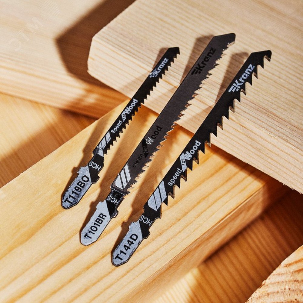 Набор полотен для электролобзика KRANZ с улучшенной заточкой зубьев предназначен для работ по дереву и оргстеклу. Полотно отлично подходит для всех марок электролобзиков с креплением для Т-образного хвостовика и надежно фиксируется в патроне. Выполнено из высокоуглеродистой стали.Улучшенная закалка токами высокой частоты увеличивает твердость зубьев и обеспечивает высокий ресурс. Тип распила- быстрый/ламинат/фигурный. Толщина материала для распила 8-60/4-30/4-30 мм.