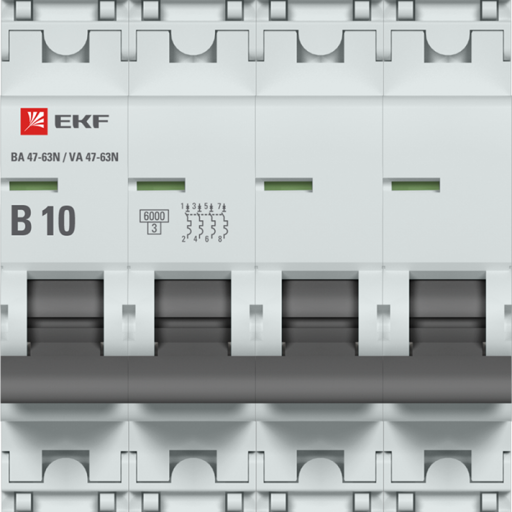 Описание Выключатель автоматический модульный 4п B 10А 6кА ВА 47-63N PROxima EKF M636410B