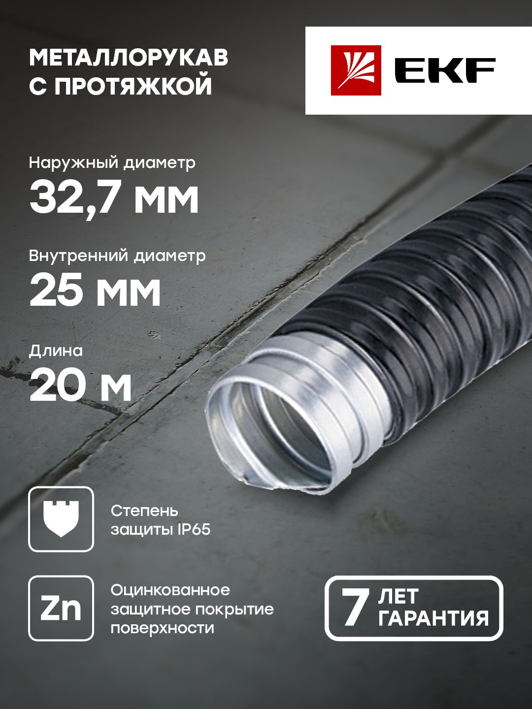 Металлорукав нг ПВХ РЗ-ЦП - 25 с протяжкой (20 м) EKF PROxima, Труба и короб для прокладки кабеля