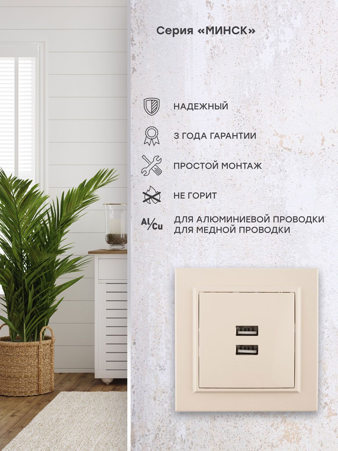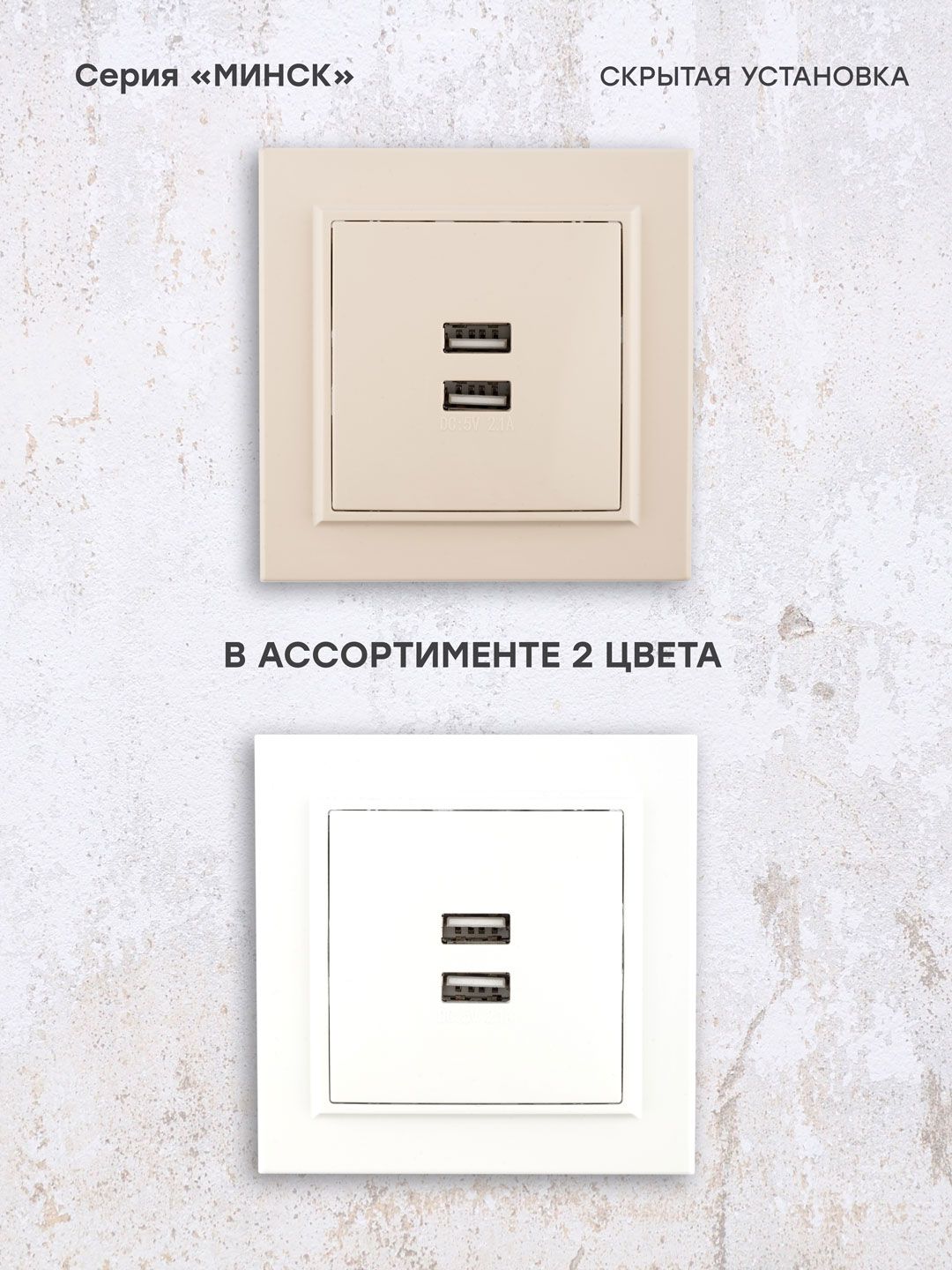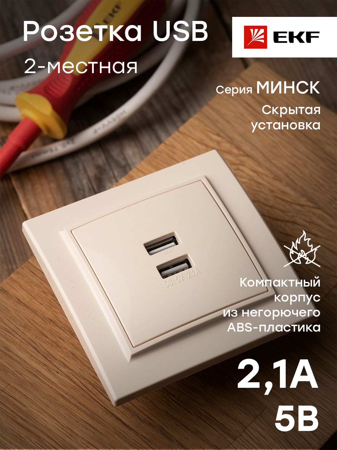 Описание Минск Розетка USB 2-местная СП 2,1А бежевая EKF
