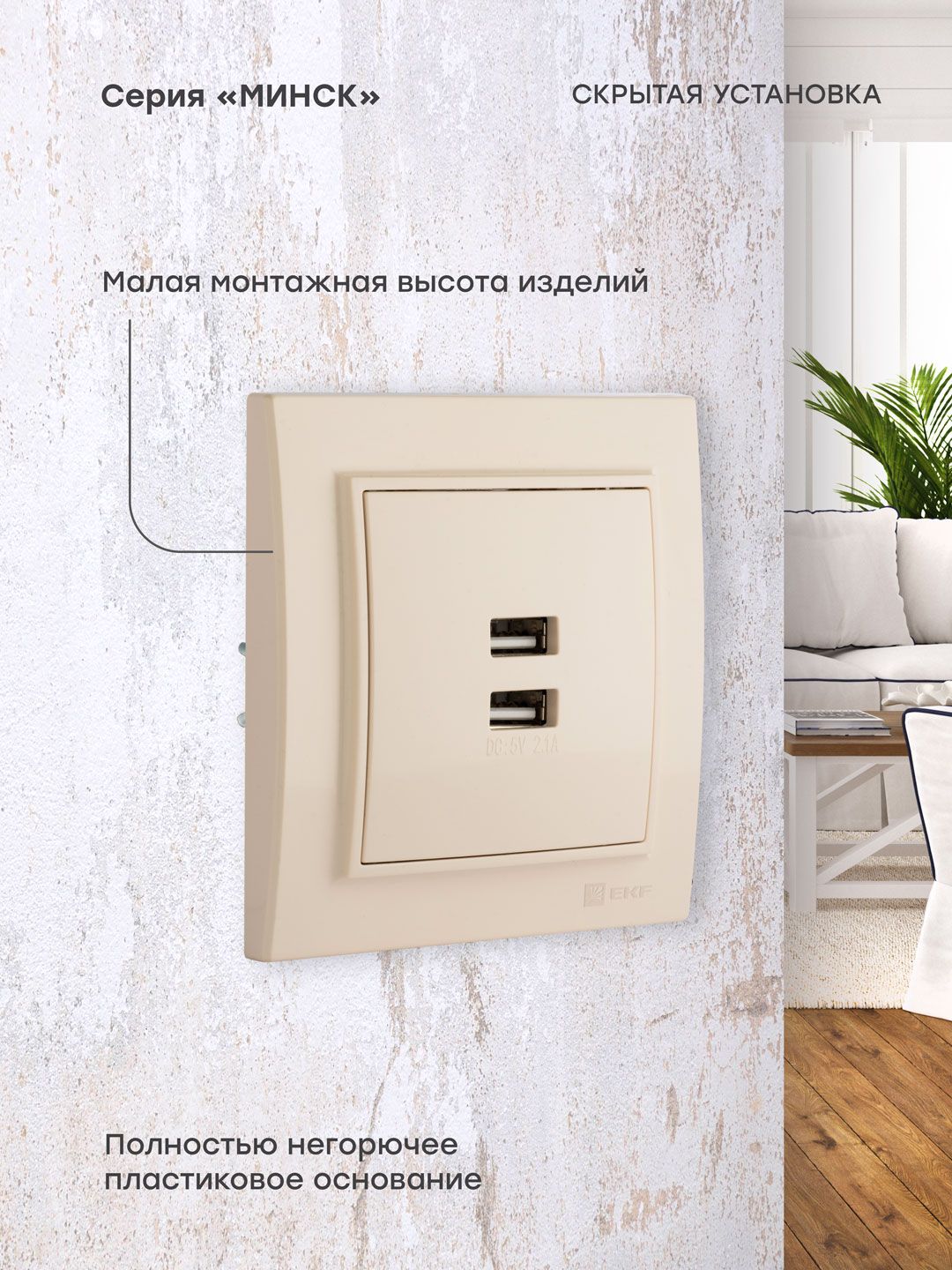 Минск Розетка USB 2-местная СП 2,1А бежевая EKF, Розетка скрытого монтажа