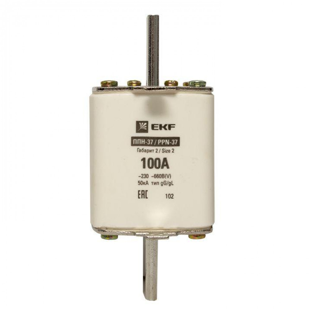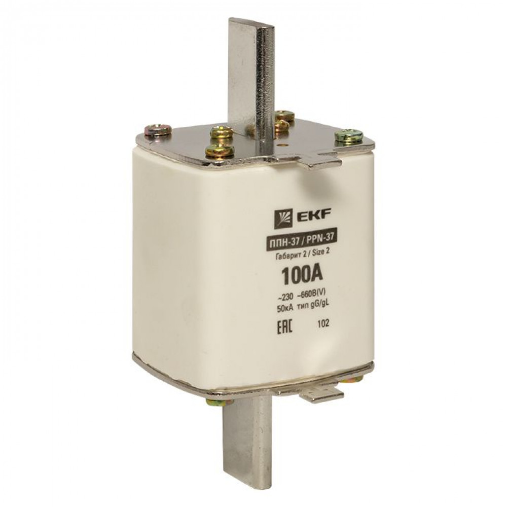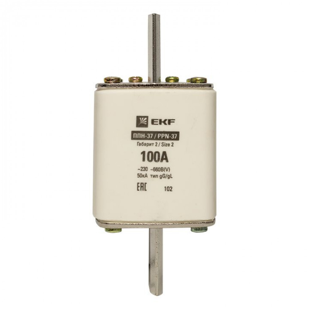 Плавкая вставка ППН-37 400/100А габарит 2 EKF. Предохранители плавкие ППН EKF, укомплектованные плавкими вставками типа gG/gL, предназначаются для защиты кабельных линий и промышленных электроустановок от токов перегрузки и короткого замыкания. Предохранители применяются в электрических сетях переменного тока частотой 50 Гц с напряжением до 660В. Применяются для крепления в распределительных и вводно-распределительных устройствах. Предохранители плавкие ППН могут устанавливаться в основание с держателем, а также в специально предназначенные рубильники. В комплект поставки предохранителей плавких ППН основание с держателем не входит и приобретается отдельно.