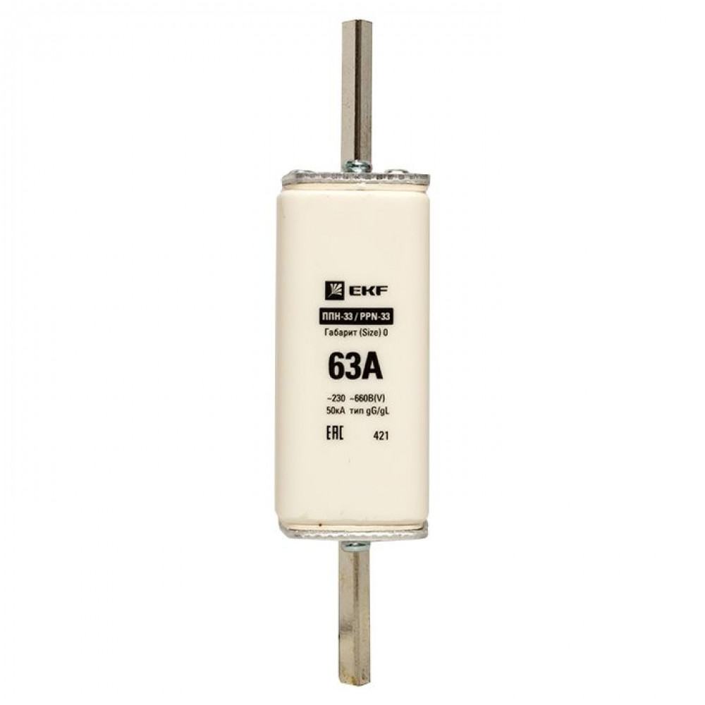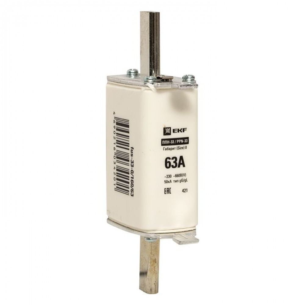 Плавкая вставка ППН-33 160/ 63А габарит 0 EKF. Предохранители плавкие ППН EKF, укомплектованные плавкими вставками типа gG/gL, предназначаются для защиты кабельных линий и промышленных электроустановок от токов перегрузки и короткого замыкания. Предохранители применяются в электрических сетях переменного тока частотой 50 Гц с напряжением до 660В. Применяются для крепления в распределительных и вводно-распределительных устройствах. Предохранители плавкие ППН могут устанавливаться в основание с держателем, а также в специально предназначенные рубильники. В комплект поставки предохранителей плавких ППН основание с держателем не входит и приобретается отдельно.