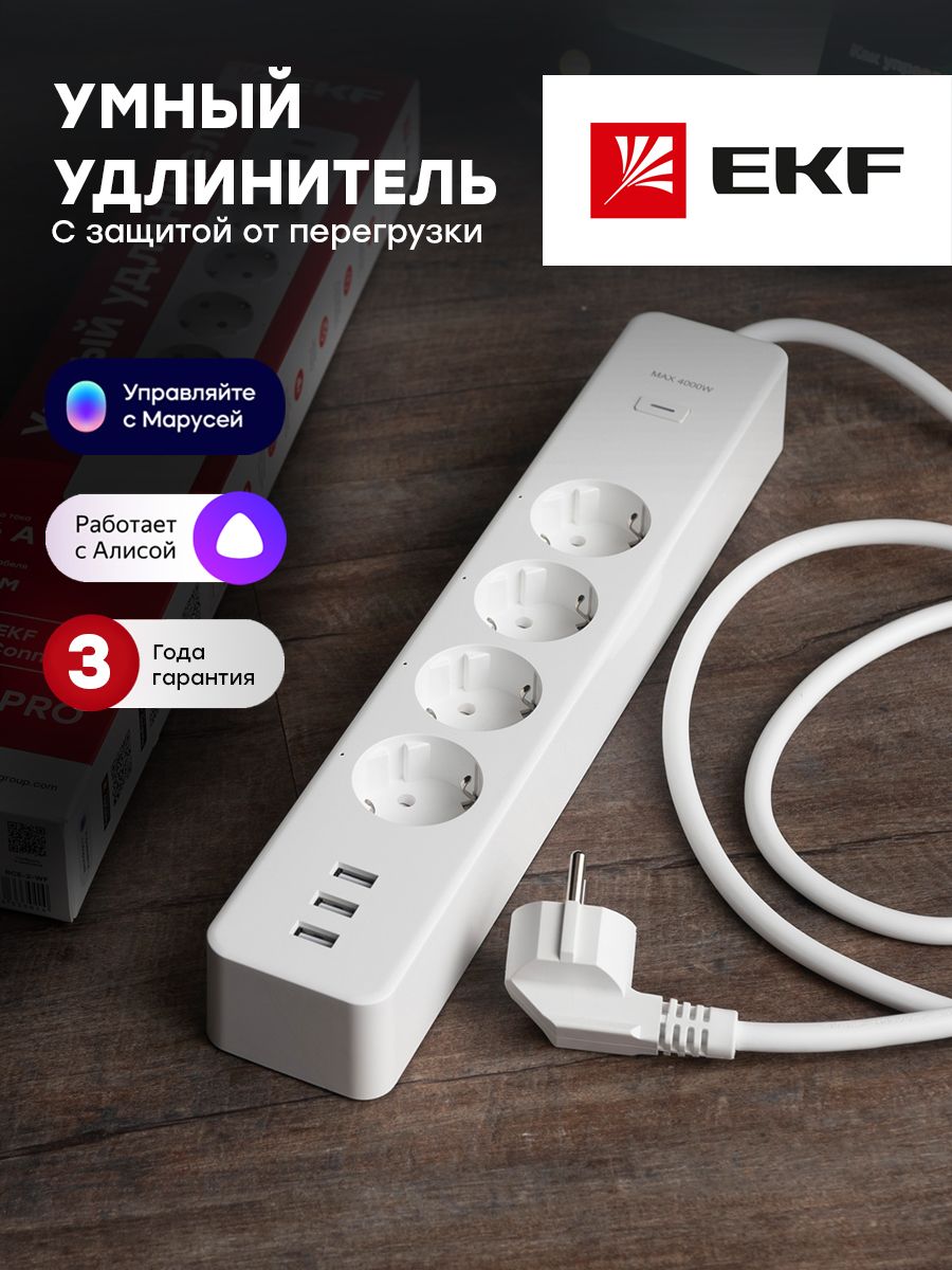 Умный удлинитель EKF Connect Pro поможет сделать обычные приборы умными. При помощи приложения EKF Connect Home для Android и iOS, а также при помощи голосовых помощников Алиса от Яндекса, Маруся от VK и Салют от Сбера можно управлять светильниками, вентиляторами, обогревателями, увлажнителями и любыми другими приборами, которые начинают работать сразу же при подаче напряжения. Версия Pro поддерживает индивидуальное управление каждой розеткой, а также позволяет измерять напряжение, силу тока, мощность, и собирать статистику энергопотребления по дням и месяцам. Кроме 4 розеток есть ещё 3 порта USB для зарядки мобильных устройств.