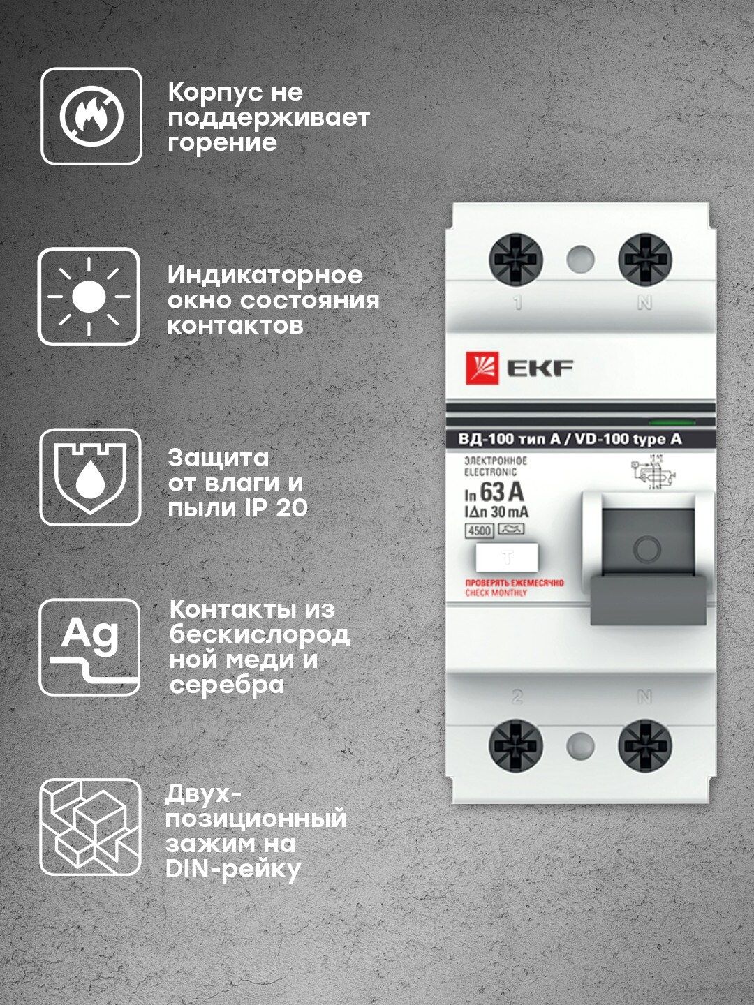 Описание Устройство Защитного Отключения ВД-100 2P 63А/ 30мА (электр, тип А) EKF PROxima