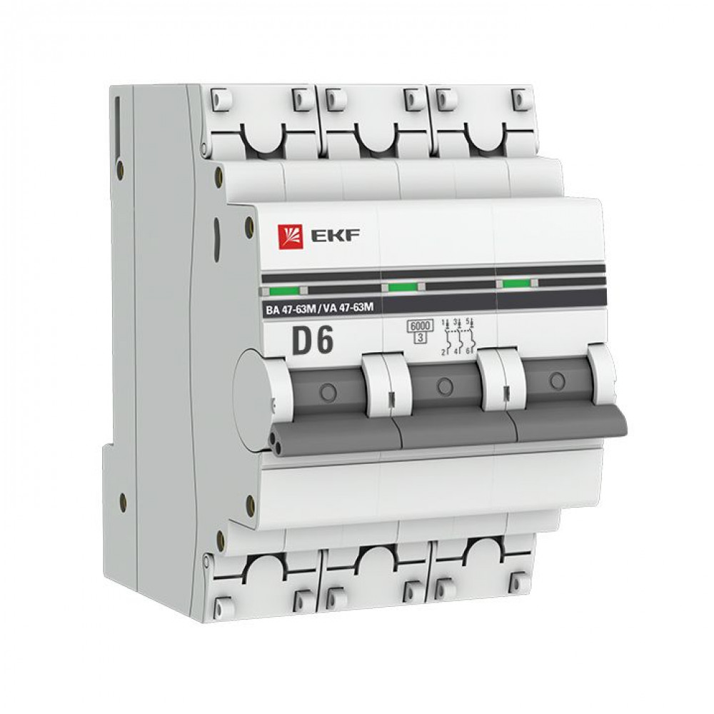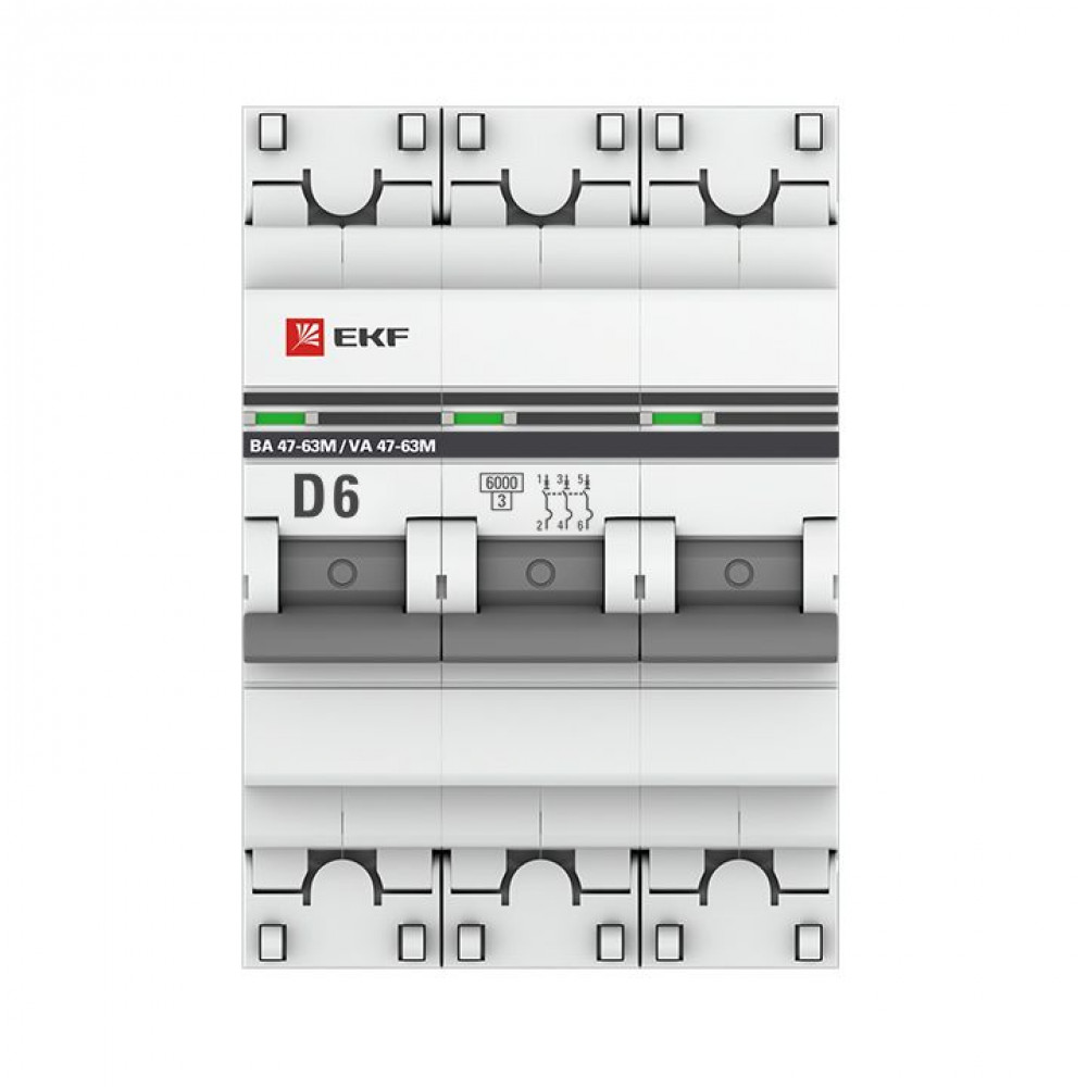 Описание Автоматический выключатель 3P 6А (D) 6кА ВА 47-63M без теплового расцепителя EKF PROxima