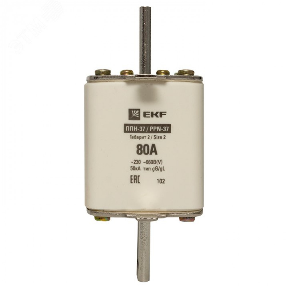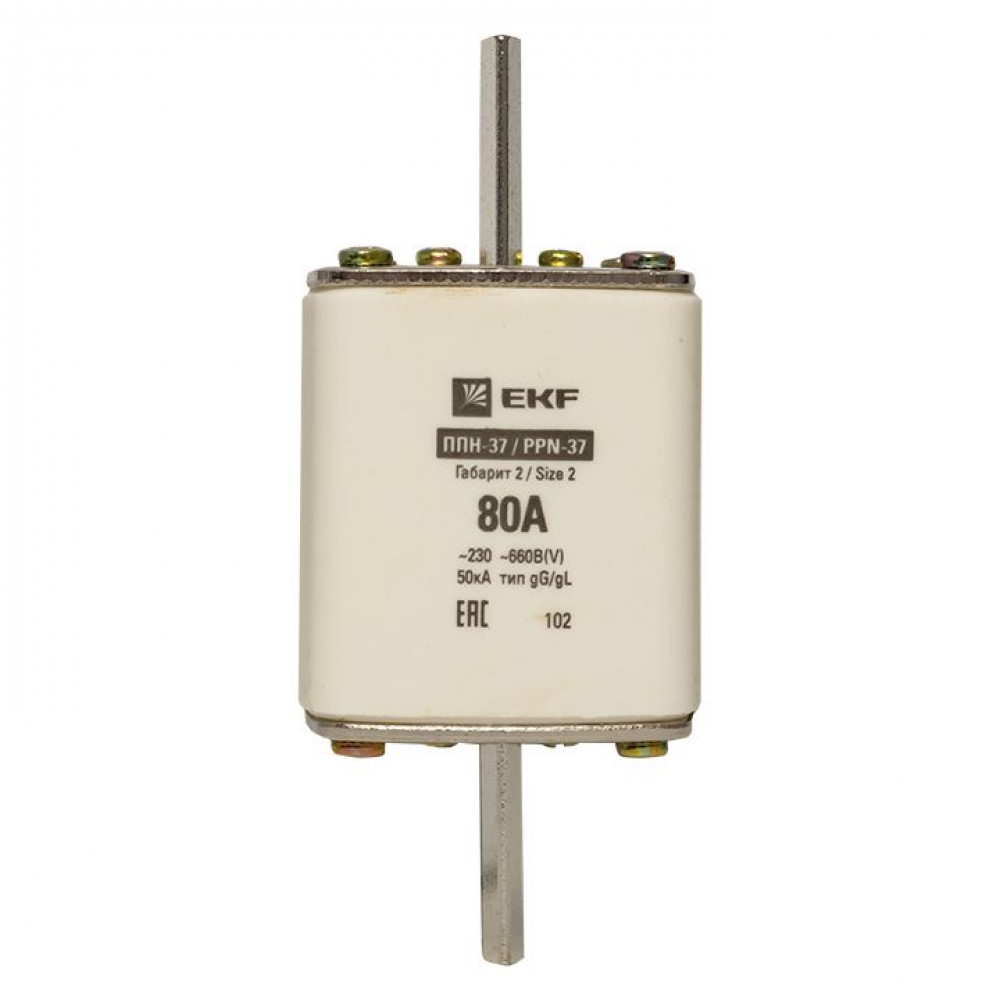 Плавкая вставка ППН-37 400/80А габарит 2 EKF. Предохранители плавкие ППН EKF, укомплектованные плавкими вставками типа gG/gL, предназначаются для защиты кабельных линий и промышленных электроустановок от токов перегрузки и короткого замыкания. Предохранители применяются в электрических сетях переменного тока частотой 50 Гц с напряжением до 660В. Применяются для крепления в распределительных и вводно-распределительных устройствах. Предохранители плавкие ППН могут устанавливаться в основание с держателем, а также в специально предназначенные рубильники. В комплект поставки предохранителей плавких ППН основание с держателем не входит и приобретается отдельно.