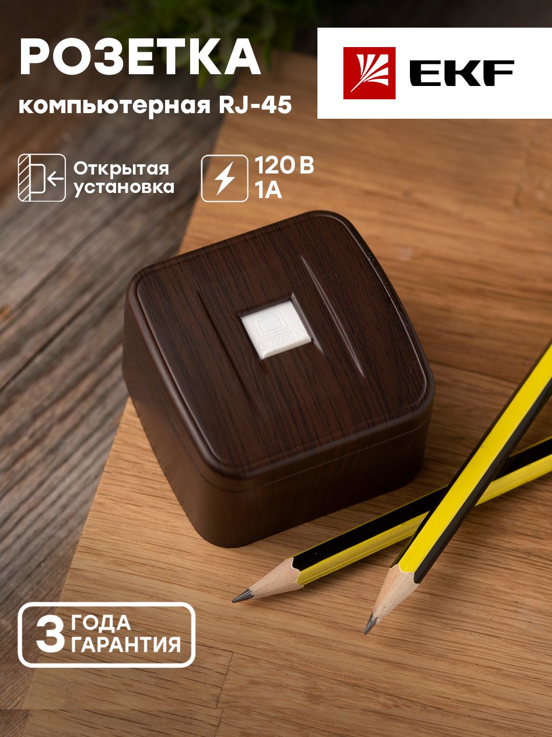Описание Розетка RJ-45 1-местная ОП Минск, 1А, 120В, т-мное дерево EKF