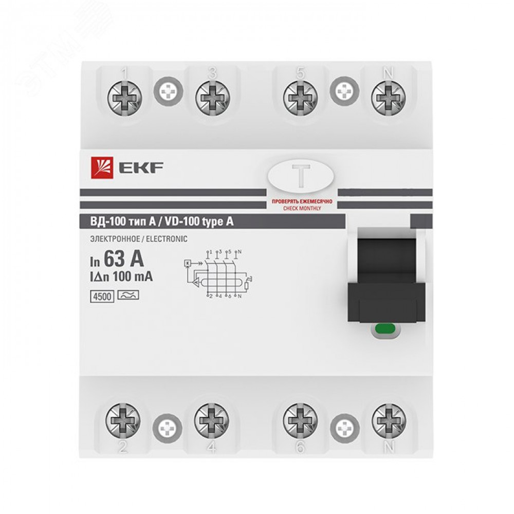 Описание Устройство Защитного Отключения ВД-100 4P 63А/100мА (электр, тип А) EKF PROxima