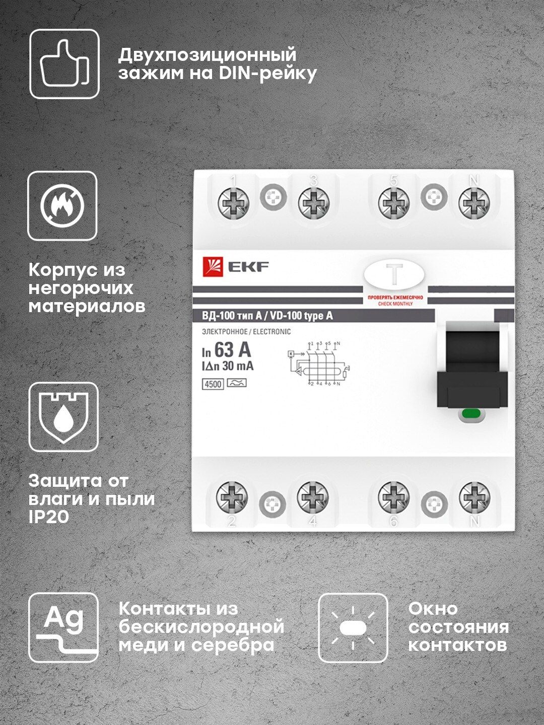 Описание Устройство Защитного Отключения ВД-100 4P 63А/ 30мА (электр, тип А) EKF PROxima