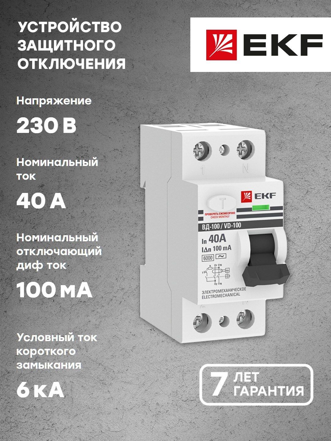 Описание Устройство защитного отключения ВД-100 2P 40А 100мА (тип АС, электромеханическое) 6кА EKF PROxima