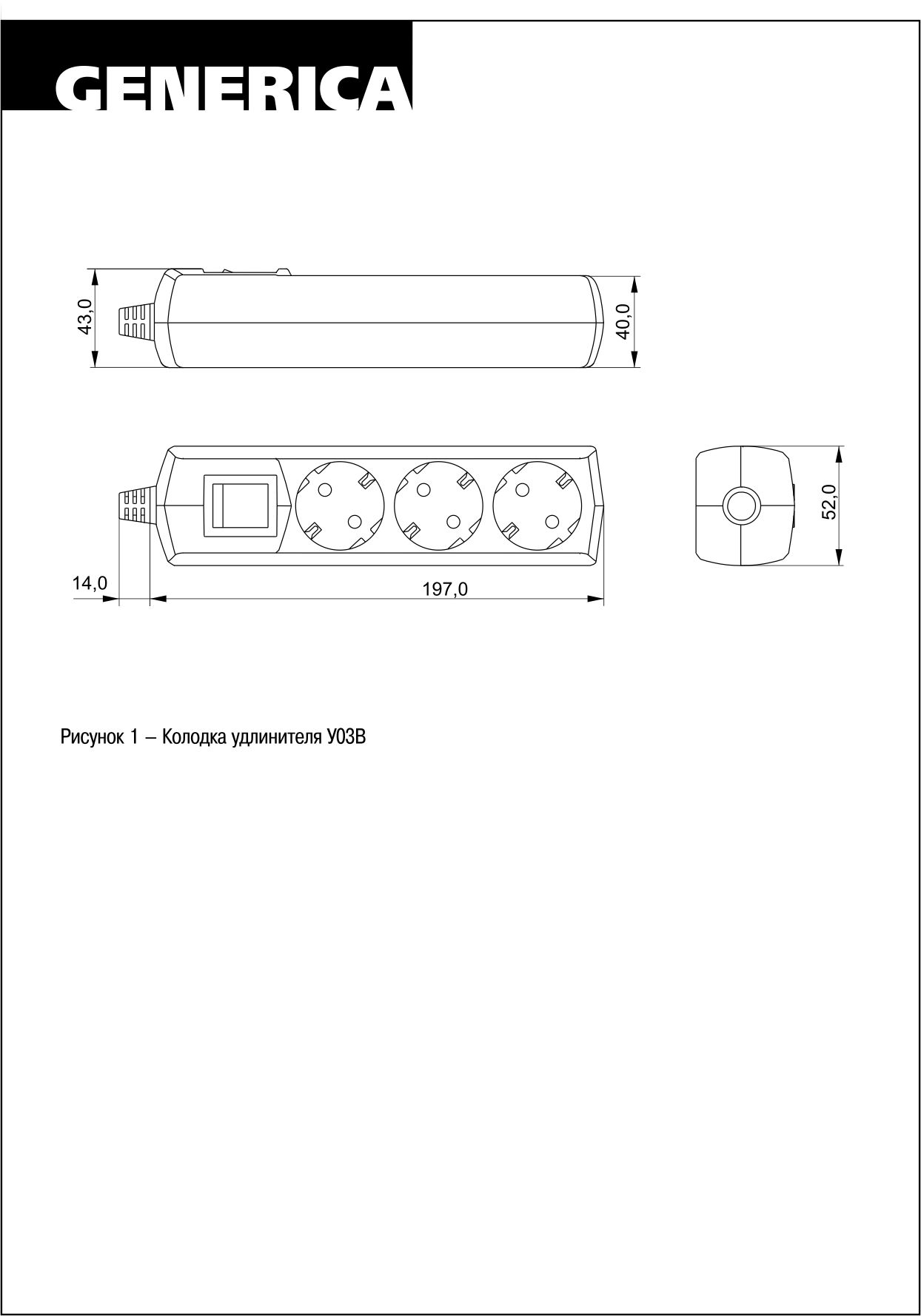 Описание Удлинитель бытовой У03В 3 места 2P+PE/1.5м 3х1мм2 10А/250В GENERICA WYP10-10-03-D15-ZK-G