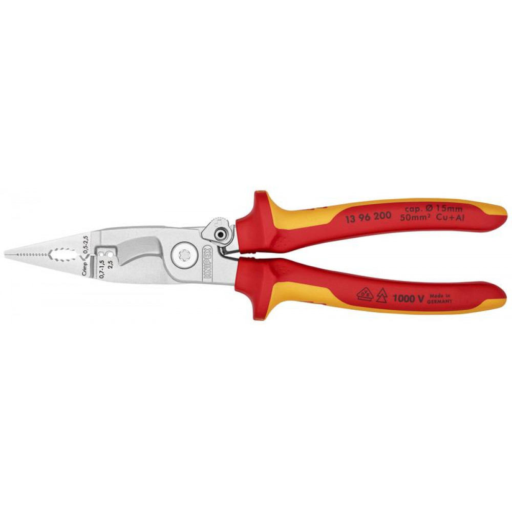 Клещи электромонтажные VDE, 6-в-1, зачистка 0.75 - 1.5 / 2.5 мм2, рез O 15 мм / 50 мм2, 200 мм-3 KN-1396200, Плоскогубцы