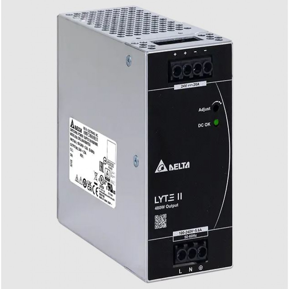 Источник питания, однофазный, 24VDC / 20A, 480W, диапазон входных напряжений: 94 - 264VAC; габариты (мм): 123.6x56x116.8, вес 0.87 кг, монтаж: на DIN рейку