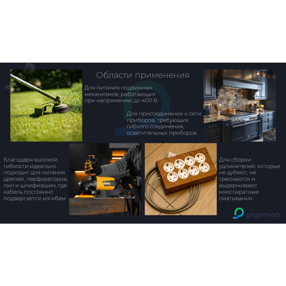 Провод соединительный, с многопроволочными медными жилами, с изоляцией и оболочкой из поливинилхлоридного пластиката. Предназначен для присоединения электрических машин и приборов различного назначения повышенной мощности к электрической сети номинальным переменным напряжением до 380/660 В. Провод применяется для присоединения к электрическим сетям подвижных и неподвижных установок бытового назначения, электроприборов, электроинструментов, машин и приборов бытового и аналогичного применения.