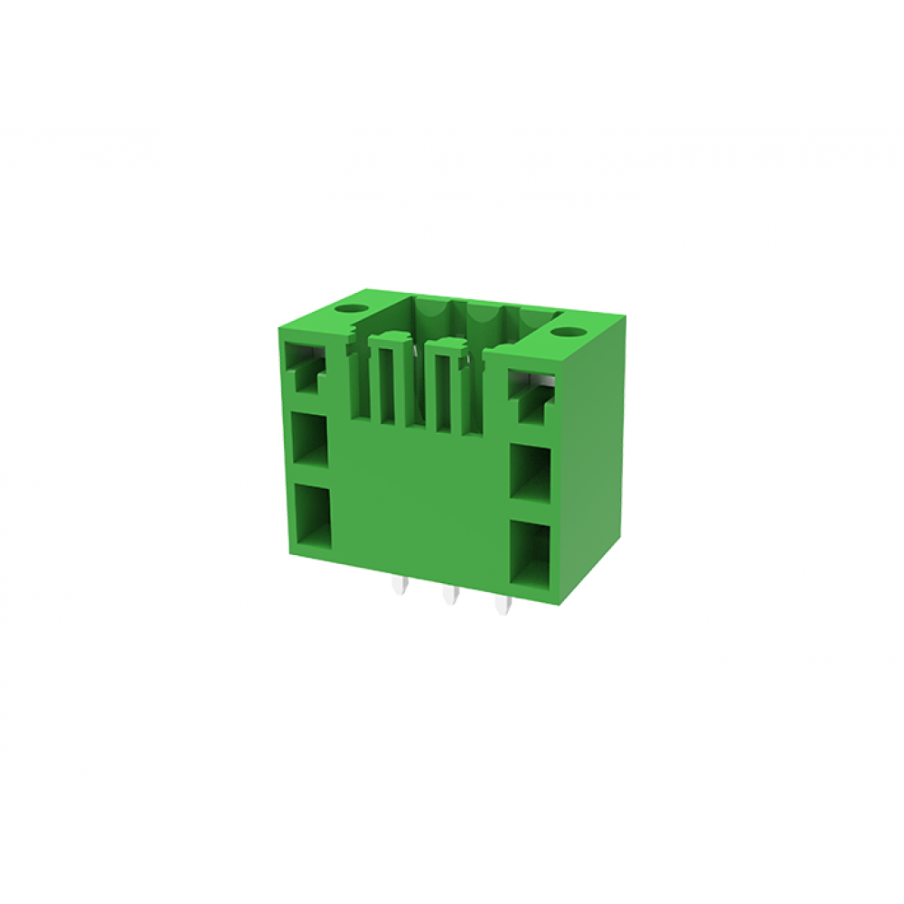 Вилочный разъем, вертикальный, два контакта на полюс, на плату, шаг: 3.5 мм, 15 полюсов, фиксация на плате пайкой, исполнение: с монтажными фланцами, 125V, 10A, цвет: зеленый