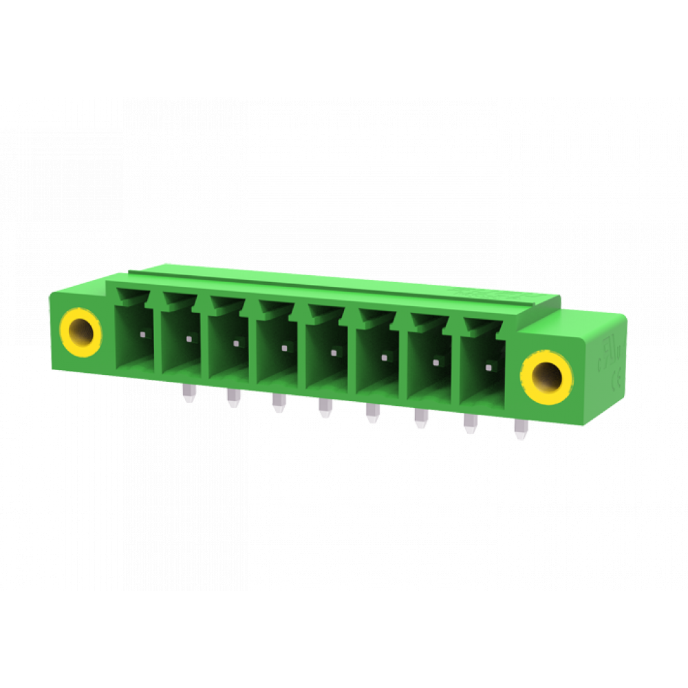 Вилочный разъем на плату MC-PA3.5H02-F-0002, Вилочный разъем, горизонтальный, на плату, шаг: 3.5 мм, 2 полюса, фиксация на плате пайкой, исполнение: с монтажными фланцами, 160V, 8A, цвет: зеленый
