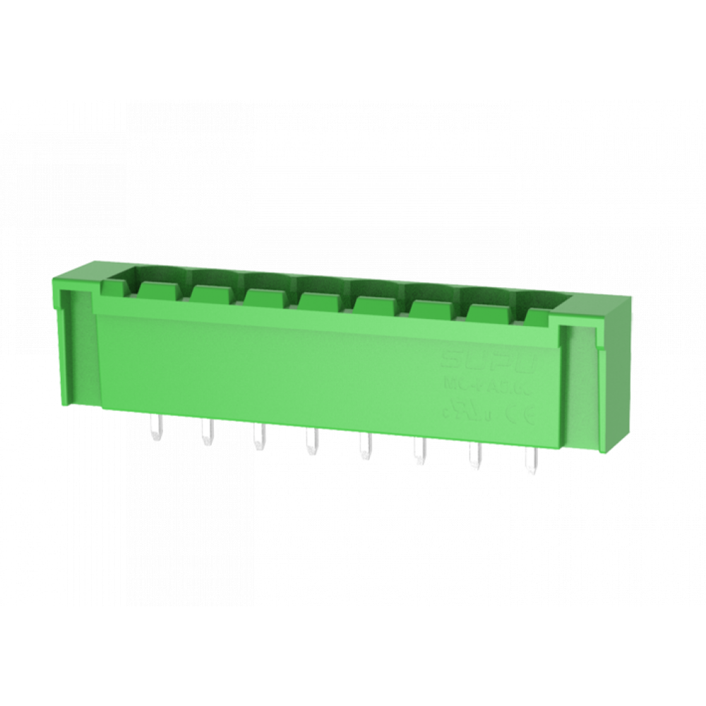 Вилочный разъем на плату MC-PA5.08V03-I-0002, Вилочный разъем, вертикальный, на плату, шаг: 5.08 мм, 3 полюса, фиксация на плате пайкой, исполнение: с дополнительной фиксацией на плате, 320V, 18A, цвет: зеленый