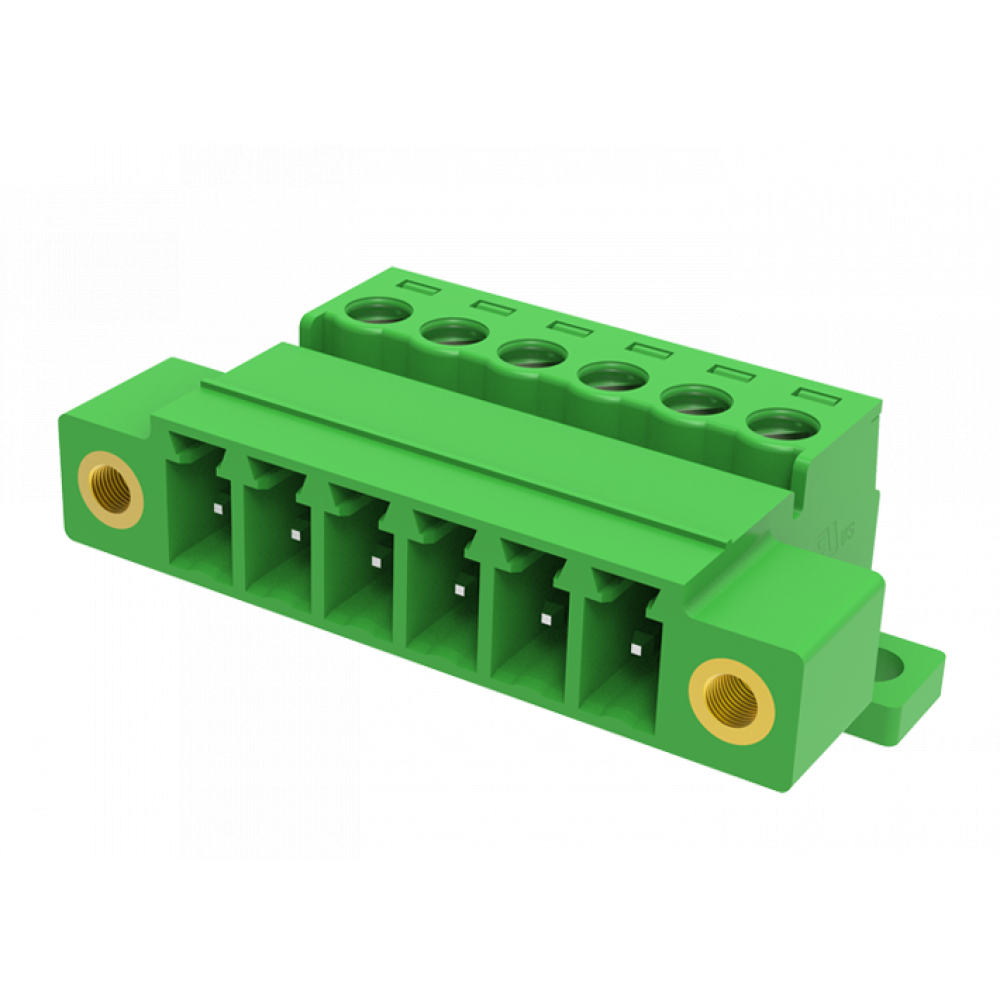 Вилочный разъем на кабель MC-PB3.81H02C-FB-0001, Вилочный разъем, прямой, на кабель, шаг: 3.81 мм, 2 полюса, фиксация провода винтовая, исполнение: с монтажными фланцами и дополнительным креплением на плате, 160V, 8A, цвет: зеленый