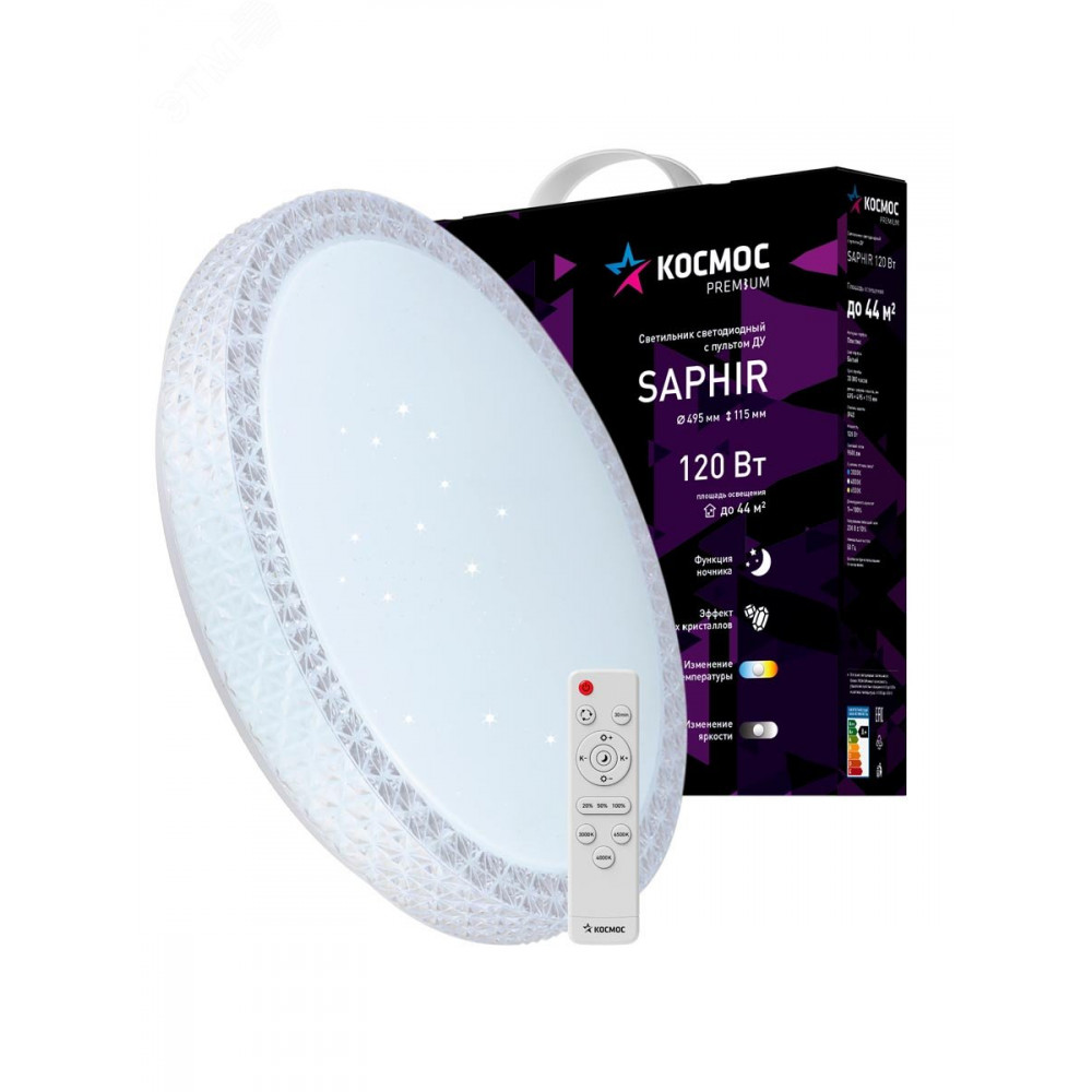 Описание Светильник светодиодный PREMIUM SAPHIR 120Вт 230В 3000-6500К 9600лм IP40 495х115мм настенно-потолоч. управляемый с пультом ДУ КОСМОС KSSaph120W