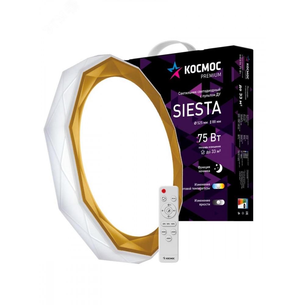 Описание Светильник светодиодный PREMIUM SIESTA 75Вт 230В 3000-6500К 6000лм IP40 525х88мм настенно-потолоч. управляемый с пультом ДУ КОСМОС KSSies75W