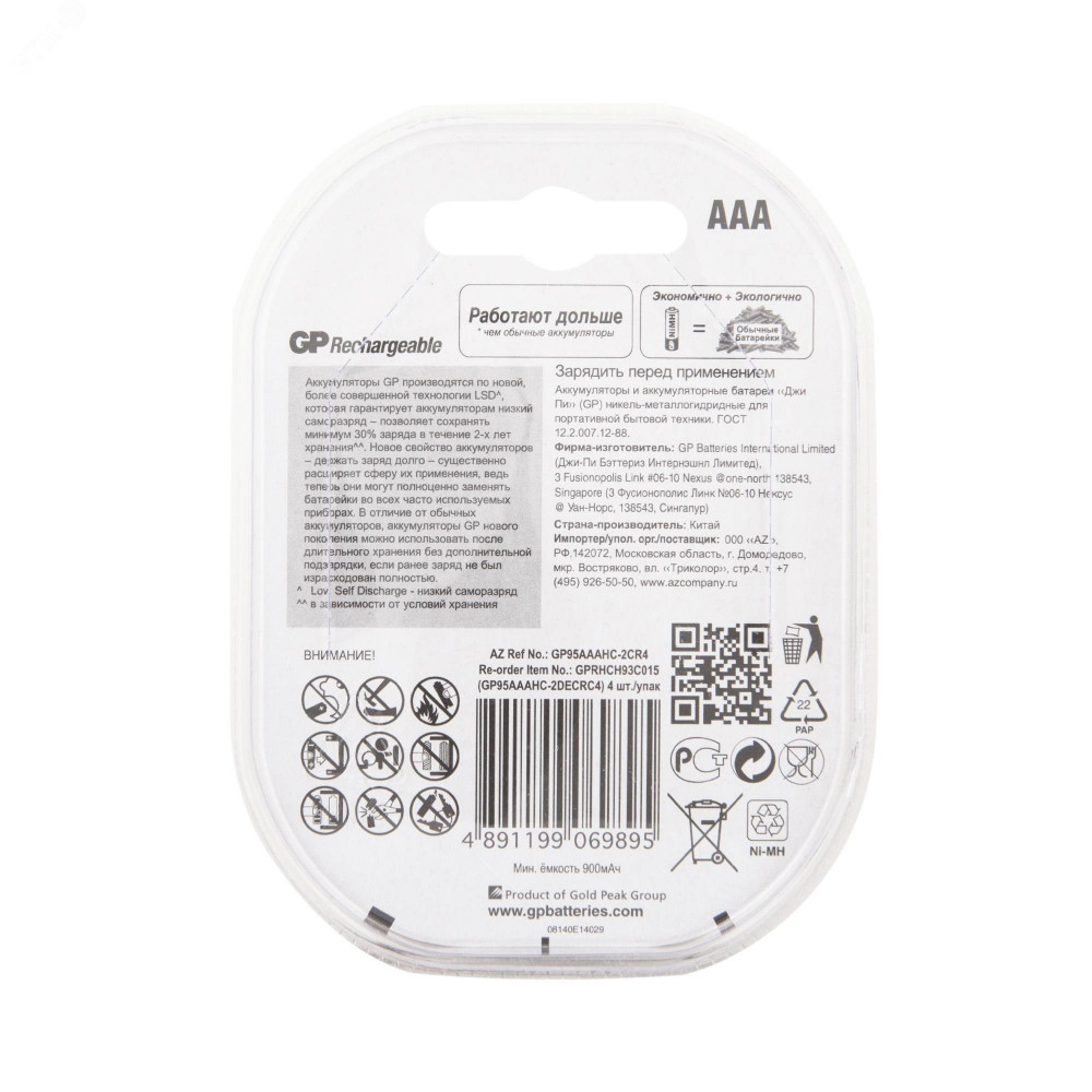 Описание Аккумулятор перезаряжаемый GP 95AAAHC AAA, емкость 950 мАч. в клемшеле 8846