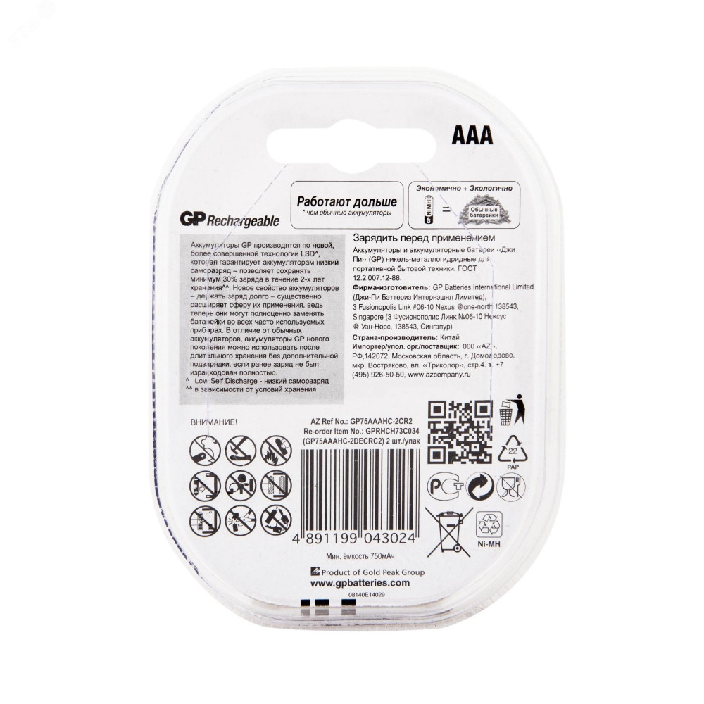Описание Аккумулятор перезаряжаемый GP 75AAAHC AA, емкость 750 мАч - 2 шт. в клемшеле 8471