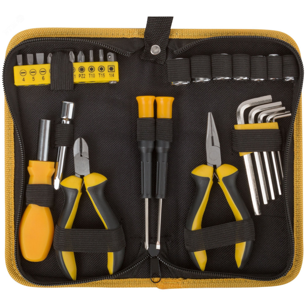 Набор инструмента 29 шт(отвертки, биты, ключи HEX, пассатижи), матерчатый чехол 65137, Набор инструмента