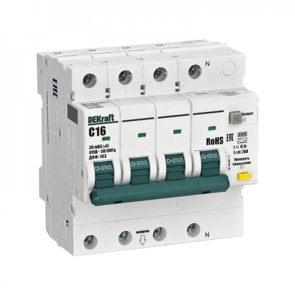 Описание Выключатель автоматический дифференциального тока (АВДТ) 3P+N 16А 30мА A х-ка C ДИФ-103 6кА DEKraft 16428DEK