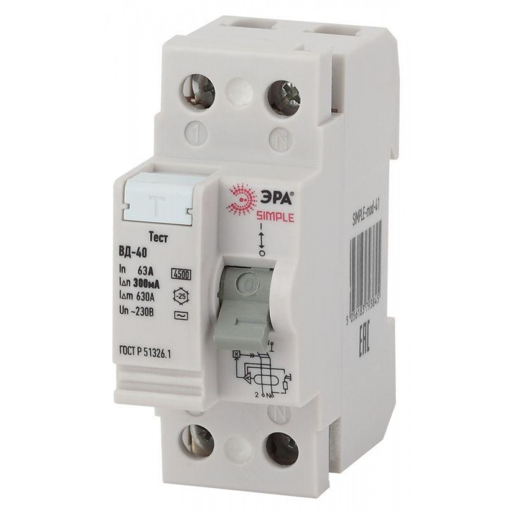 Описание Выключатель дифференциального тока (УЗО) 2п 63А/300мА ВД-40 (электронное) SIMPLE-mod-52 ЭРА Б0039272