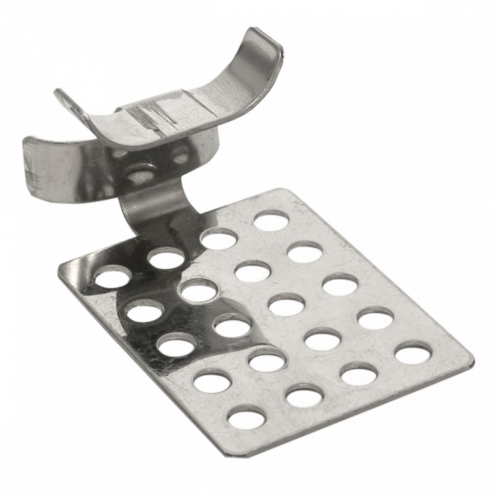 Зажим предназначен для крепления нагревательных кабелей в случае обогрева края кровли. Крепление к кровле осуществляется с помощью Полиуретанового клея - герметика Рабберфлекс ПРО ПУ-50 (или аналога). Поставляется в упаковках по 50 шт.