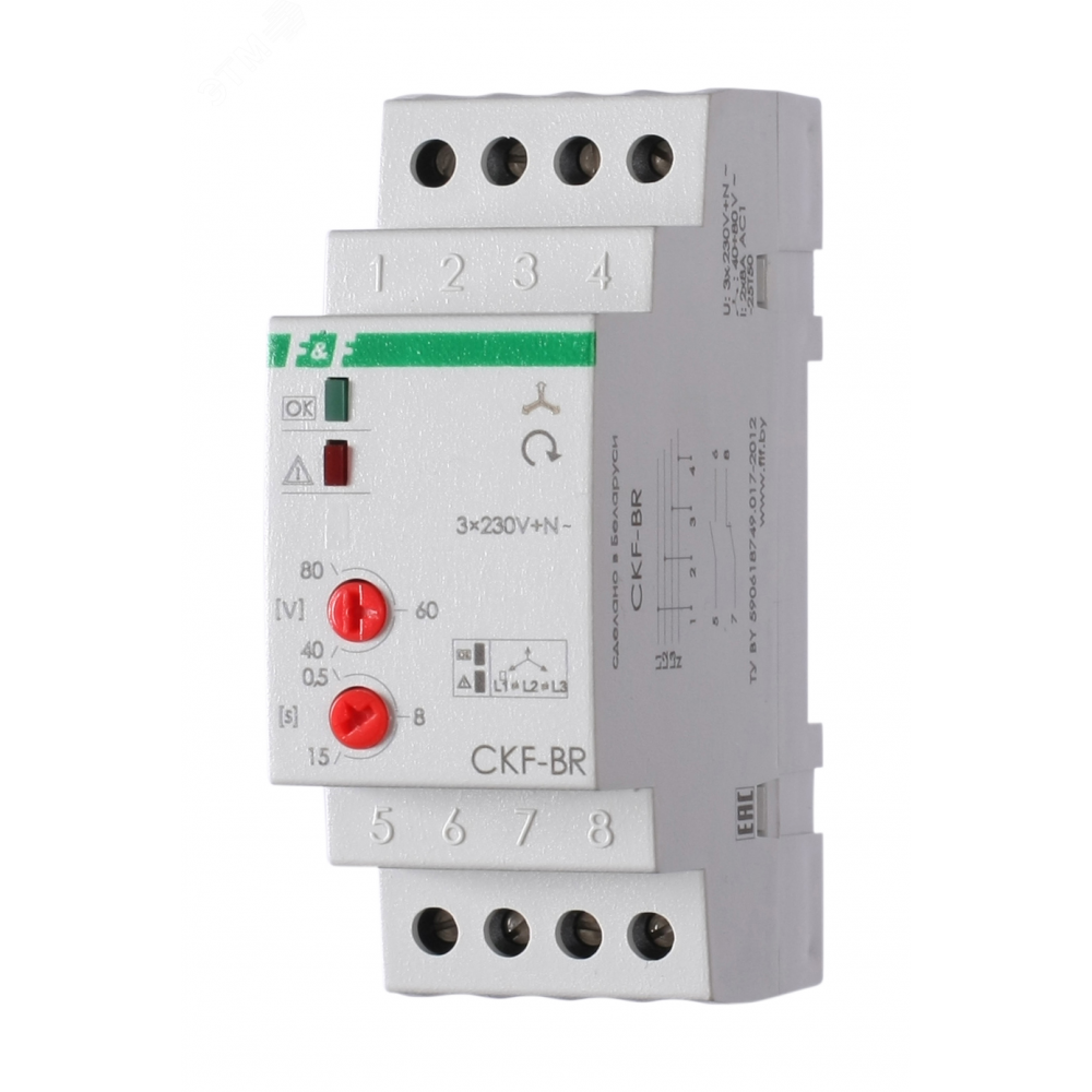 Описание Реле контроля наличия и чередования фаз CKF-BR (монтаж на DIN-рейке 35мм; регулировка порога отключения; регулировка времени отключения; 3х400/230+N 2х8А 1Z 1R IP20) F&F EA04.002.003