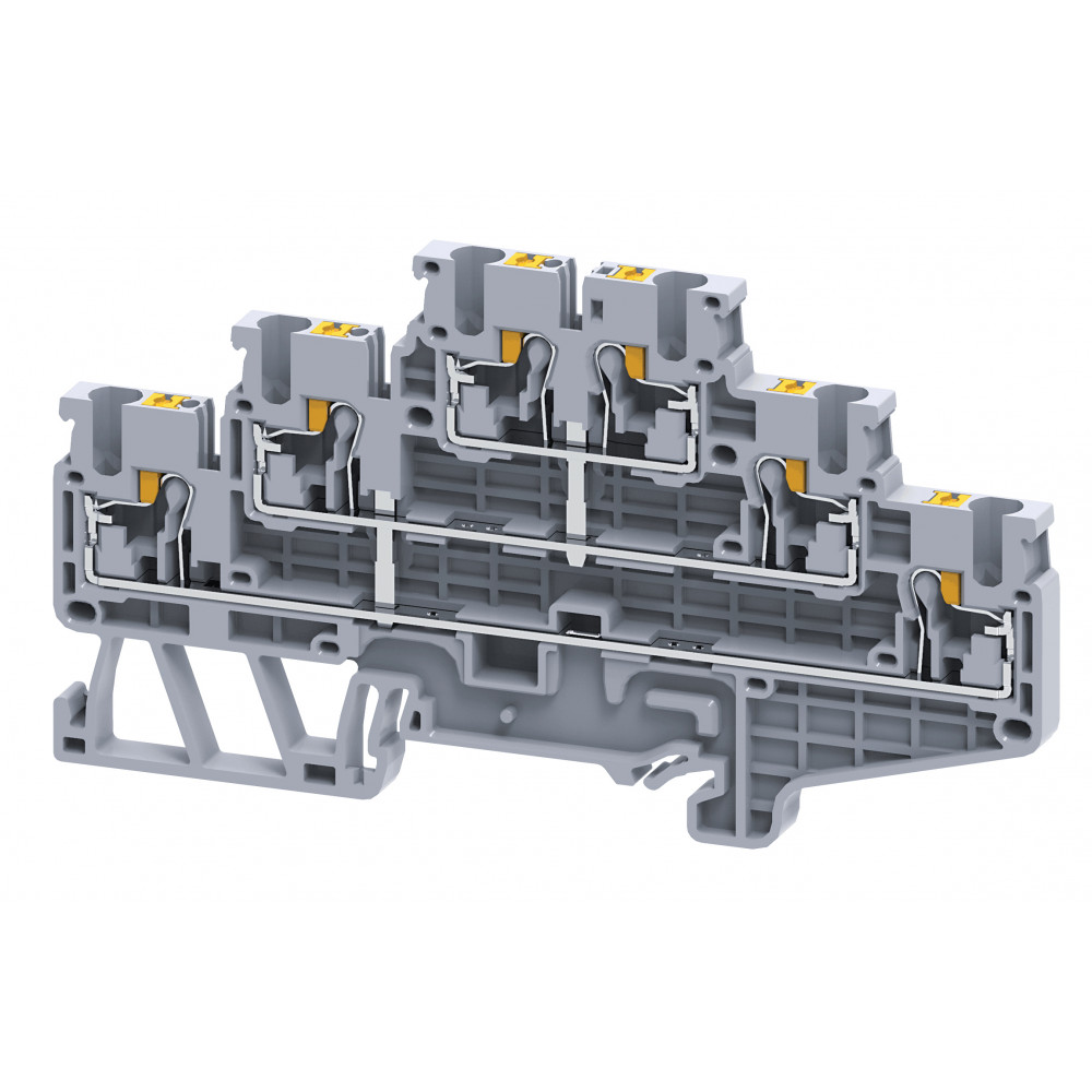 Этажная клемма, 3 этажа, межэтажное соединение, тип фиксации провода: Push-in, номинальное сечение: 2,5 мм кв., 22A, 500V, ширина: 5,2 мм, цвет: серый, тип монтажа: DIN35