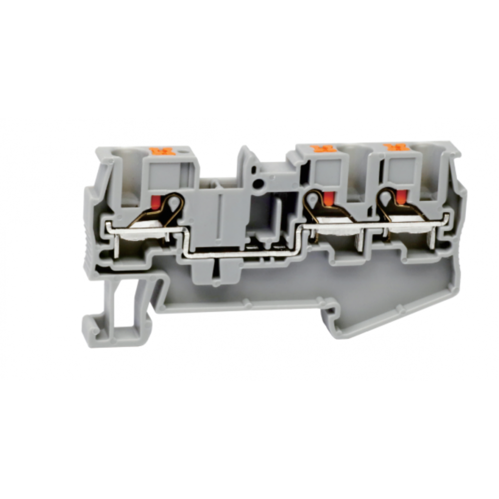 Проходная клемма, 3 точки подключения, тип фиксации провода: Push-in, номинальное сечение: 4 мм кв., 32A, 800V, ширина: 6,2 мм, цвет: серый, тип монтажа: DIN35, втычная перемычка,