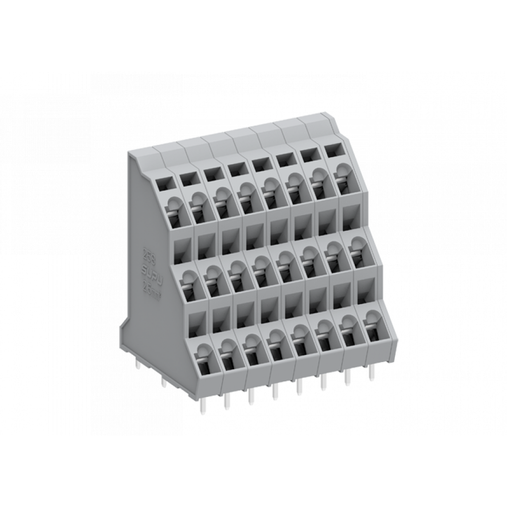 Клемма, 3 этажа, подвод кабеля 45 град., на плату, шаг: 5.0 мм, 2x3 полюса, фиксация провода пружинная, исполнение: стандартное, 320V, 21A, цвет: серый