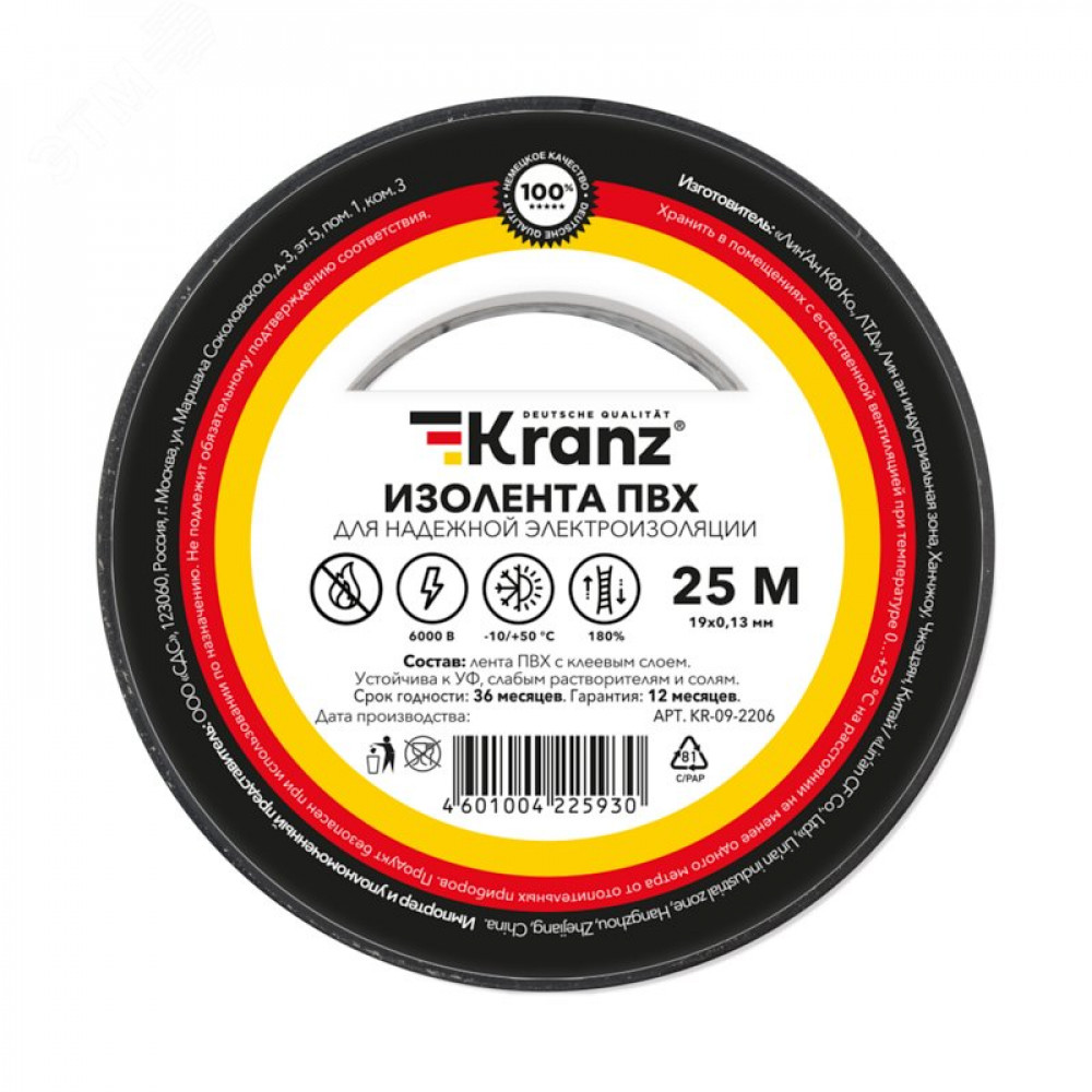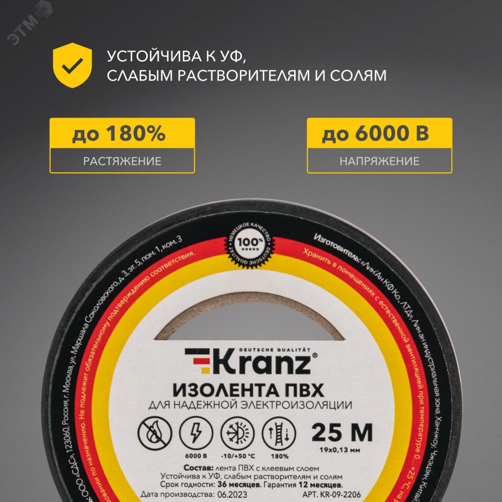 Изолента ПВХ KRANZ 0.13х19 мм, 25 м, черная 5шт KR-09-2206, Изоляционная лента и изоляционный материал