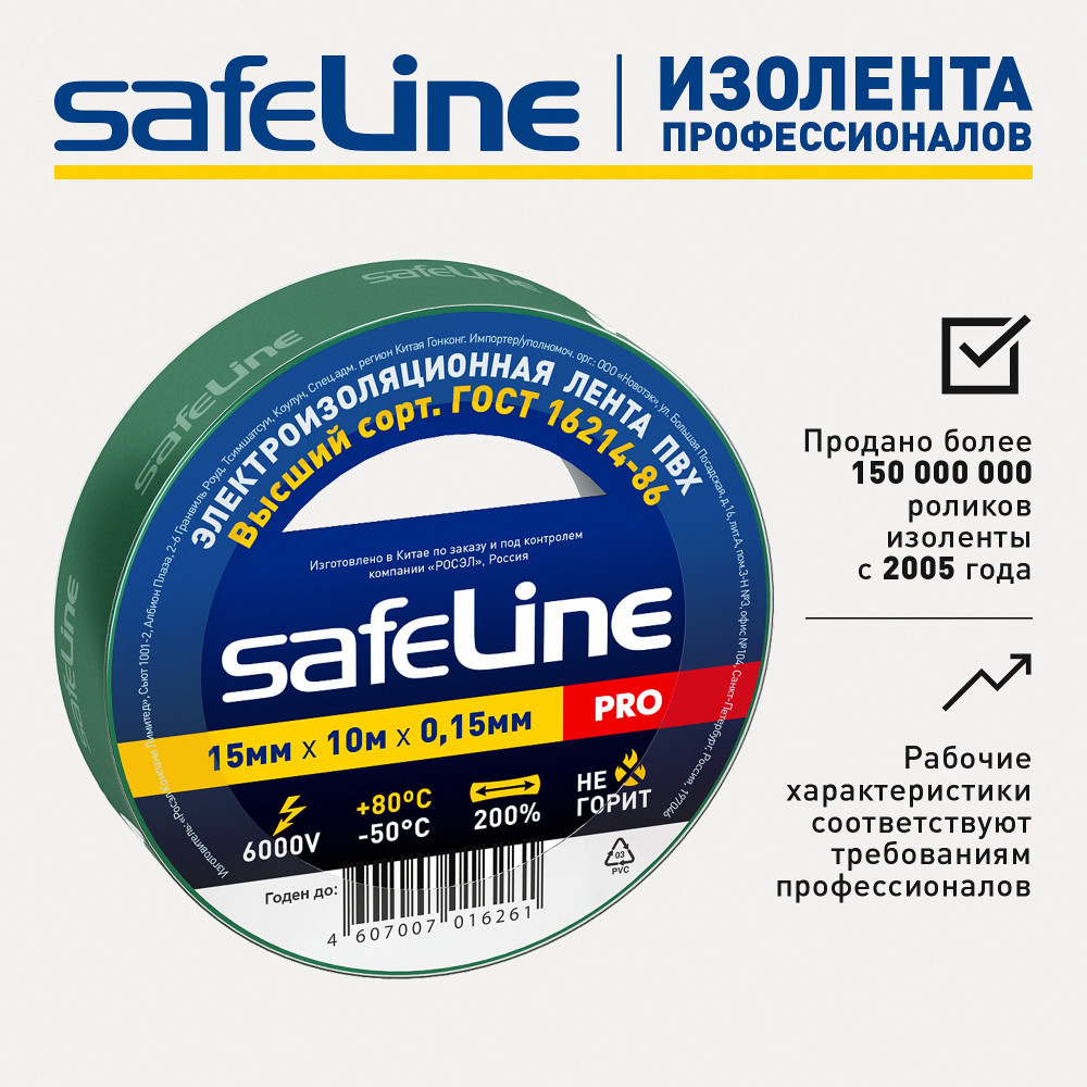 Изолента Safeline 15/10 зеленый 12119, Изоляционная лента и изоляционный материал