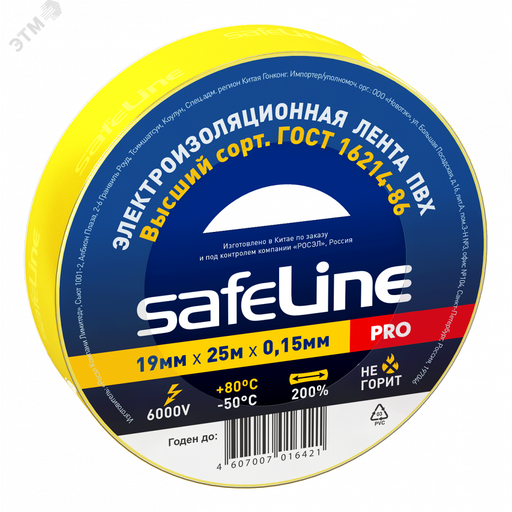 Изолента SAFELINE изготовлена на основе пленки из ПВХ изоляционного пластиката. Специальные добавки повышают эластичные свойства ленты, увеличивают ее долговечность и обеспечивают устойчивость к горению. Соответствует требованиям ГОСТ 16214-86 для изолент Высшего сорта. Изолента серии PRO предназначена для проведения электромонтажных работ и рекомендуется для профессионального и бытового применения.