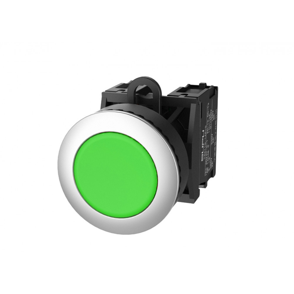 Кнопка круглая плоская, с блокировкой, без подсветки, утопленное алюминиевое переднее кольцо, без контактной группы, диаметр головки кнопки 36 мм, диаметр посадочного отверстия: 22 мм, цвет: зеленый