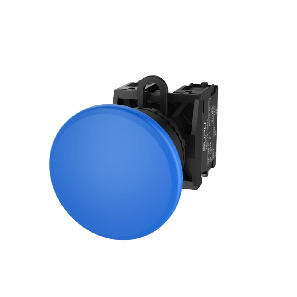 Кнопка грибовидная, без блокировки, без подсветки, пластиковое переднее кольцо, с мгновенным нажатием, с контактной группой 1NO, диаметр головки кнопки 40 мм, диаметр посадочного отверстия: 22 мм, цвет: синий