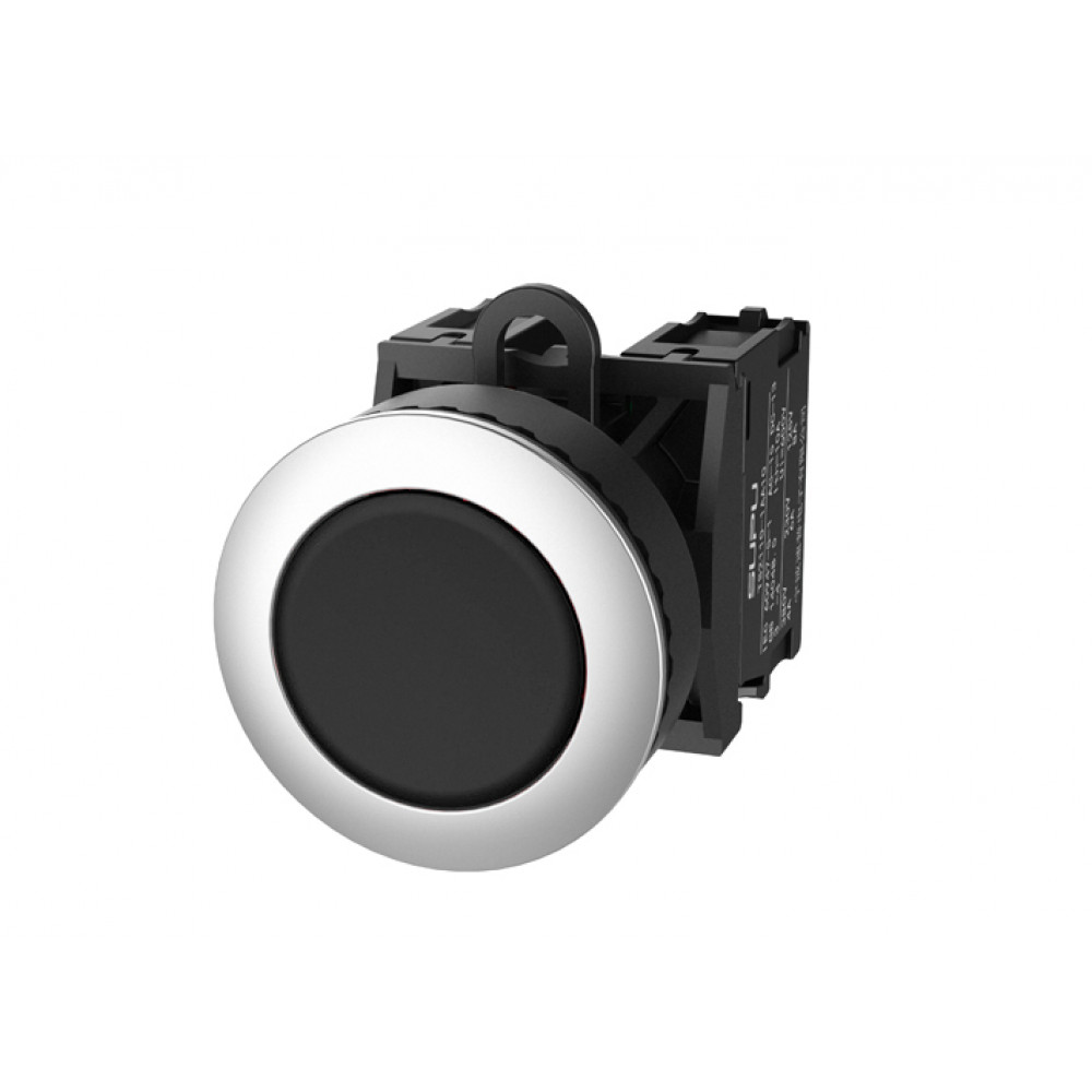 Кнопка круглая плоская, без блокировки, без подсветки, утопленное алюминиевое переднее кольцо, с плавным нажатием, с контактной группой 2NO, диаметр головки кнопки 36 мм, диаметр посадочного отверстия: 22 мм, цвет: черный