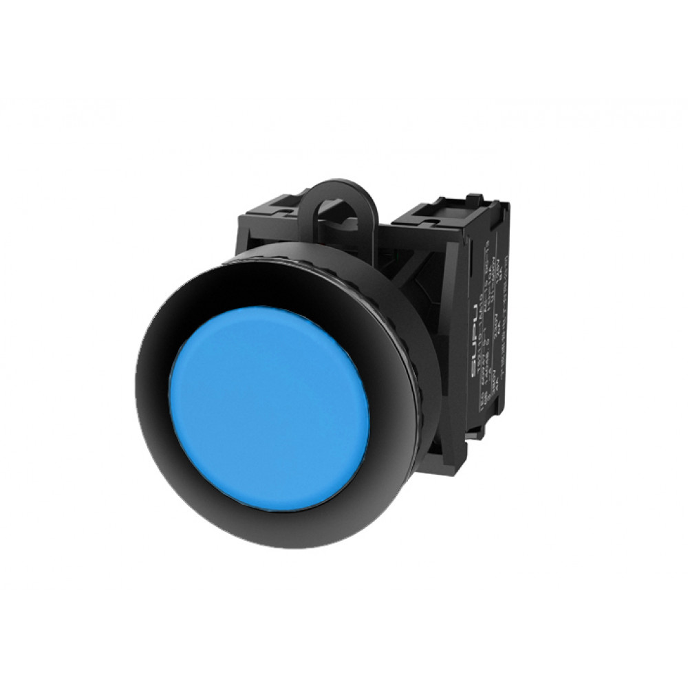 Кнопка круглая плоская, без блокировки, без подсветки, утопленное пластиковое переднее кольцо, с плавным нажатием, с контактной группой 1NO, диаметр головки кнопки 36 мм, диаметр посадочного отверстия: 22 мм, цвет: синий