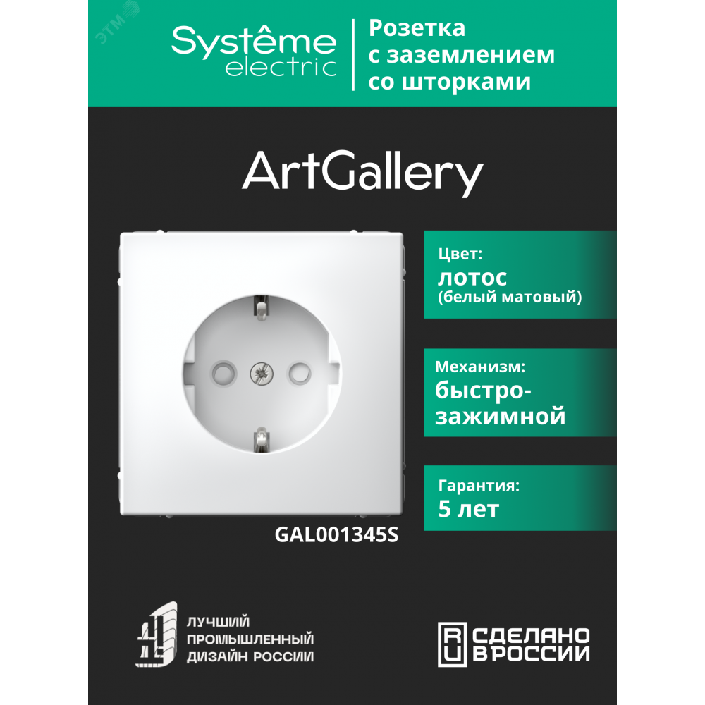 ← ARTGALLERY РОЗЕТКА с заземлением со шторками, 16А, механизм, быстрозажимные клеммы, белый GAL000145S