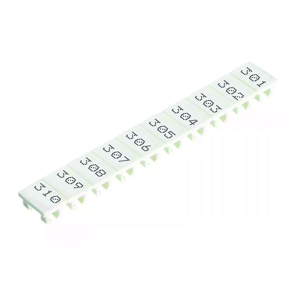 Маркировка для клемм (полоска) 9705A/6/10 B 301-310, Маркировочные шильдики, для клемм сечением 4 мм.кв., боковая / верхняя, 10 шильдиков, нанесенные символы: 301…310,с горизонтальным расположением, размер шильдика: 5,75 x 8,3 мм, цвет: белый