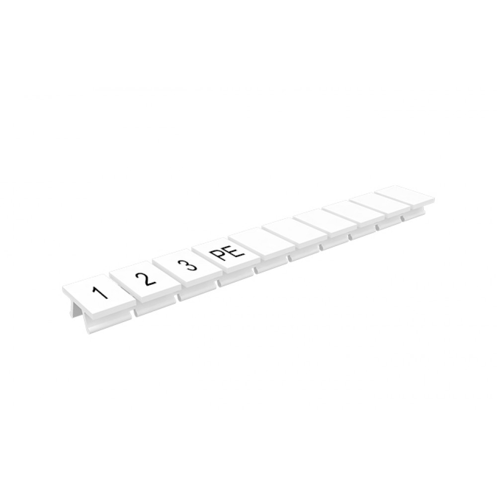 Маркировка (полоска) 306801/1,2,3,PE, Маркировочные шильдики, для клемм сечением 4 мм.кв., боковая / верхняя, 10 шильдиков, нанесенные символы: 1,2,3,PE, с горизонтальным расположением, размер шильдика: 6,3 x 10,6 мм, цвет: белый